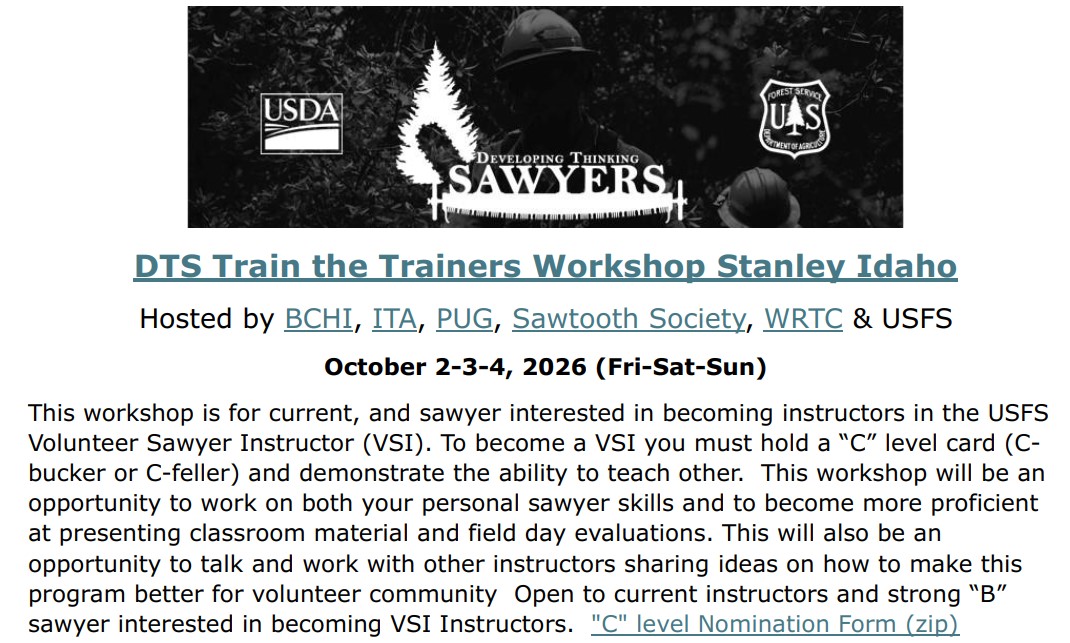 National Forest of central Idaho in May of each year.  In the Chainsaw world periodic Train-the-Trainer workshops are held around the